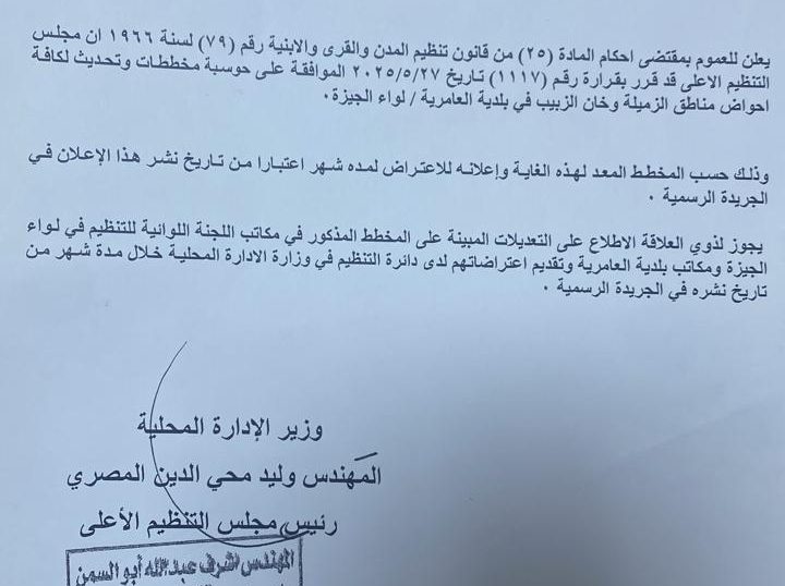 حوسبه مخططات و تحديث لكافة احواض مناطق الزميلة وخان الزبيب في بلدية العامرية و اعلان المخططات للاعتراض